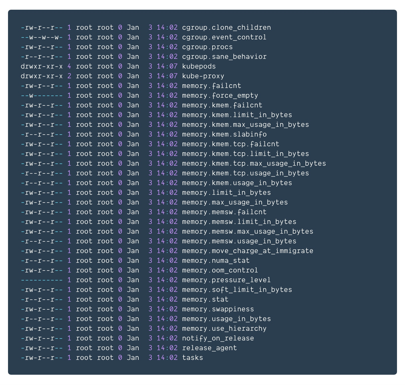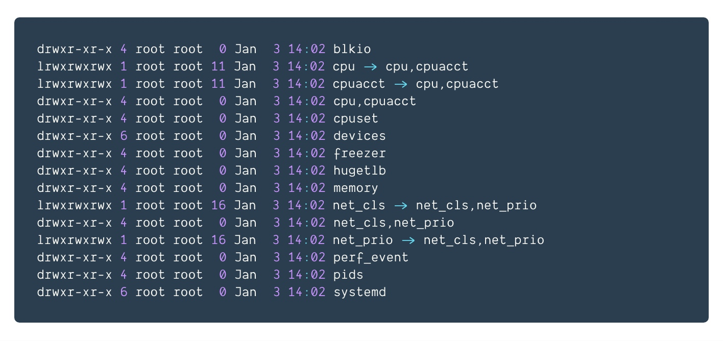一般情况下,cgroup文件夹下的内容包括CPU、内存、磁盘、网络等信息: