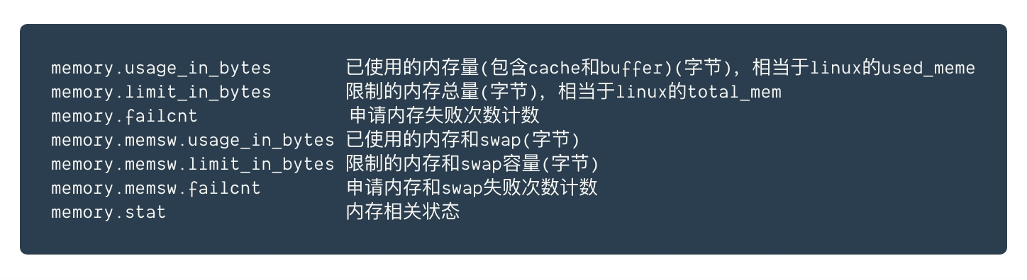 /sys/fs/cgroup/memory/docker/[id]/memory.limit_in_bytes内存使用率 = memory.usage_in_bytes/memory.limit_in_bytes