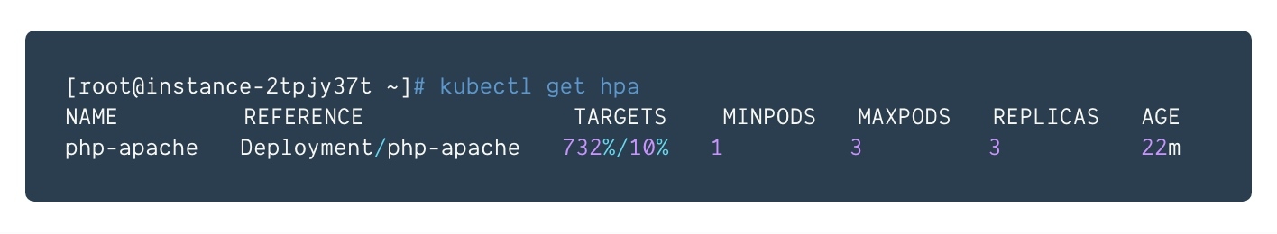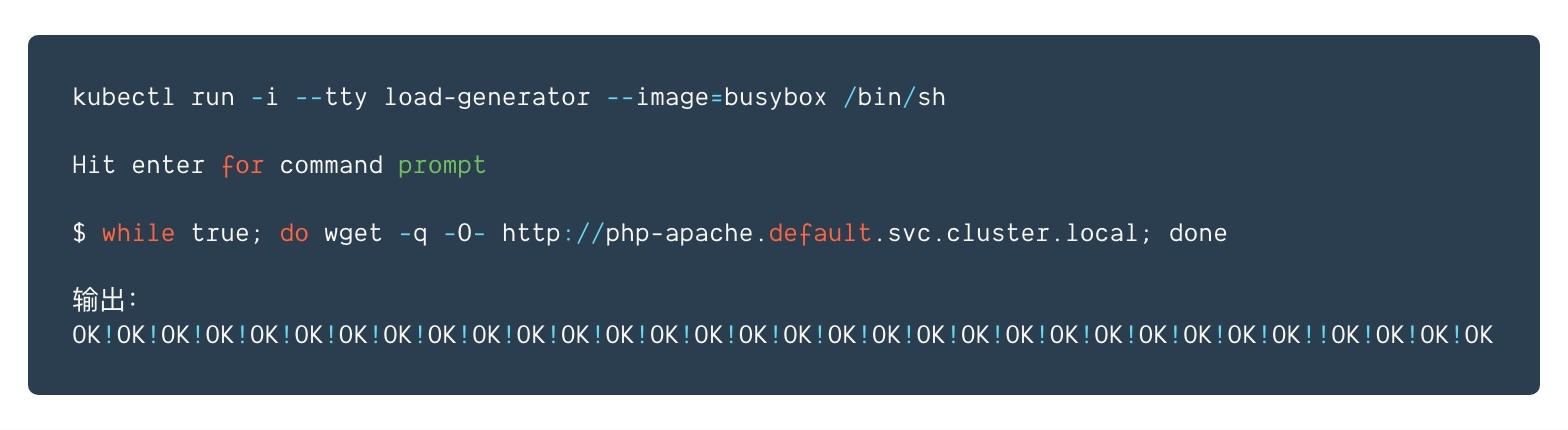4.向php-apache服务增加负载,验证自动扩缩容 启动一个容器,并通过一个循环向php-apache服务器发送无限的查询请求(请在另一个终端中运行以下命令)