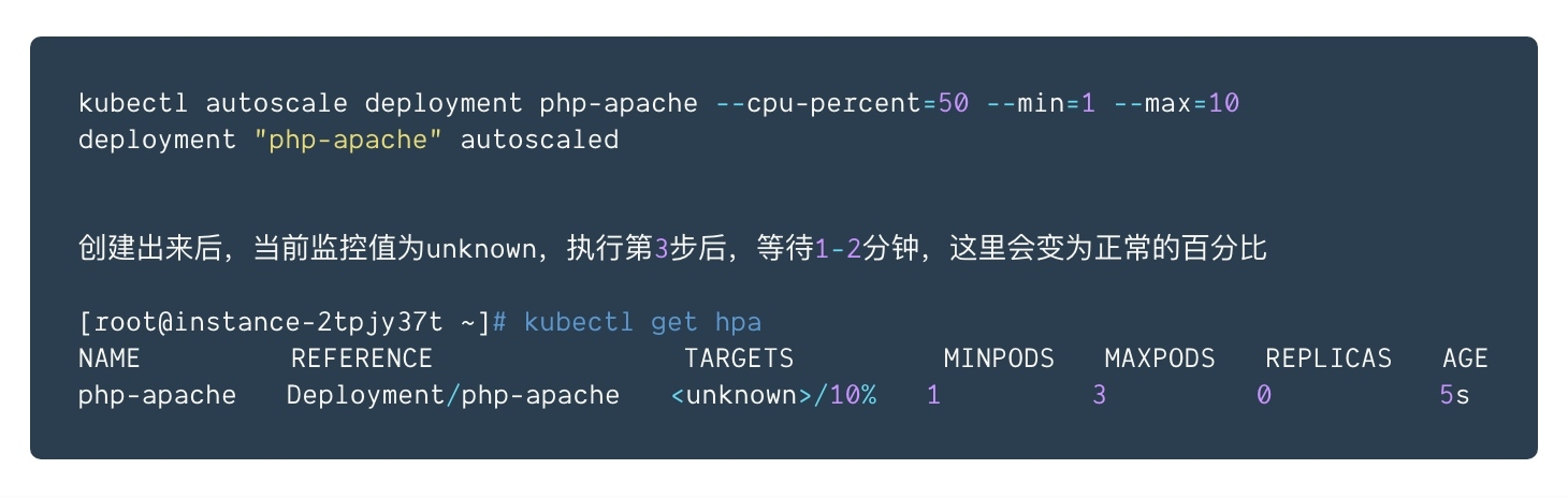 1.创建HPA资源,设定目标CPU使用率限额,以及最大、最小实例数, 一定要设置Pod的资源限制参数: request, 负责HPA不会工作。