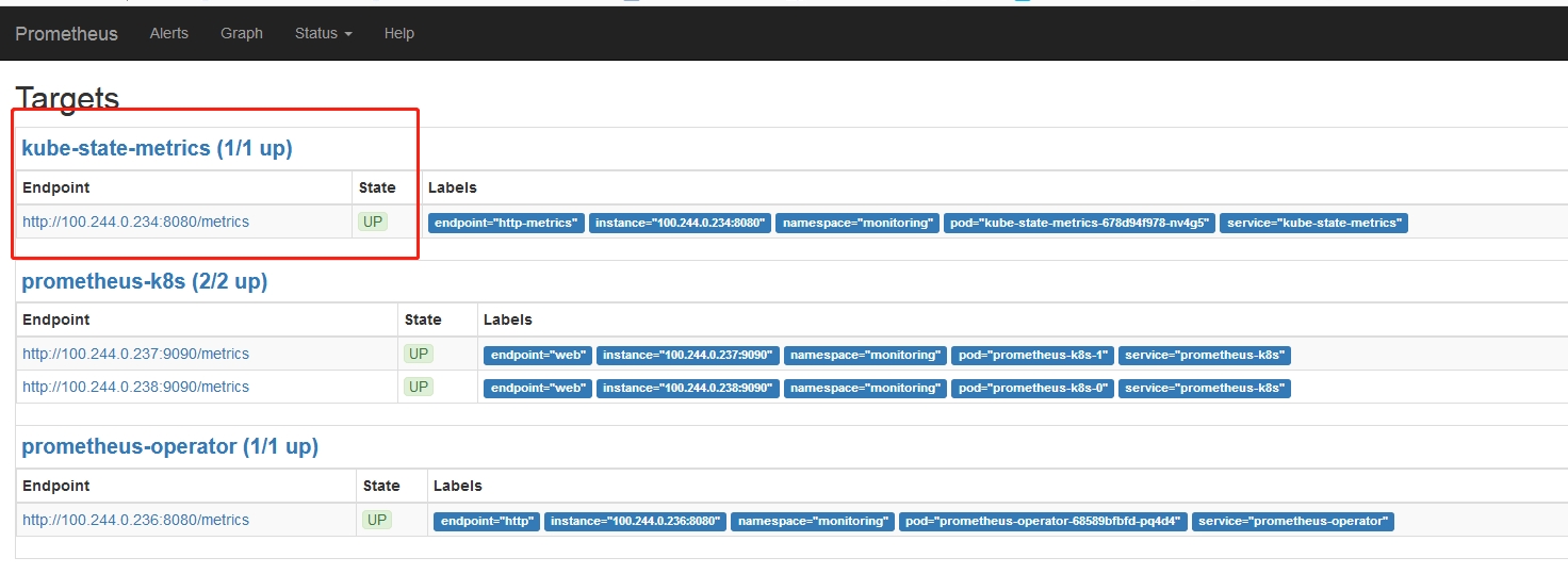标识,因此会将metric暴露给prometheus,而Prometheus会在kubernetes-service-endpoints这个job下自动发现kube-state-metrics,并开始拉取metrics,无需其他配置。